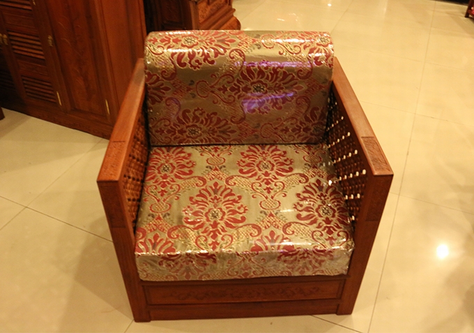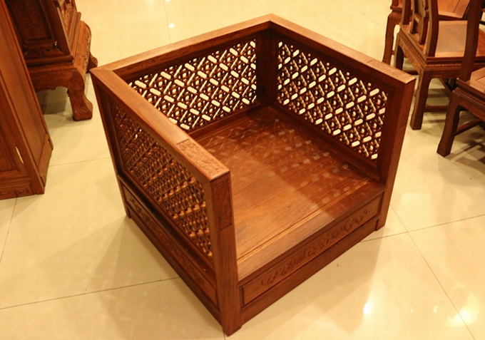 單人座沙發(fā)外觀方正匡整,兩邊扶手的高度設(shè)計(jì)的與靠背同高,而在其內(nèi)外兩側(cè)均雕繪有幅闌的鏤空幾何紋飾作為點(diǎn)綴,彰顯著浮美淡雅的中國(guó)風(fēng)式含蓄美。在沙發(fā)實(shí)際使用時(shí),配上軟墊之后的坐感也更覺舒適,沙發(fā)座腳處地設(shè)計(jì)顯得地較為獨(dú)特,也可以說它已經(jīng)將座腳處設(shè)計(jì)的概念完全融入了沙發(fā)整體,以之整體式的箱體結(jié)構(gòu)作為座腳,更覺敦實(shí)、小巧玲瓏,頗有些許歐派家具式風(fēng)格的韻味,實(shí)為別致。