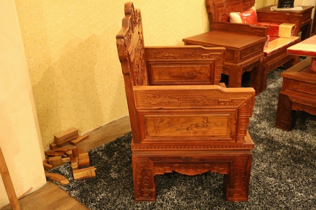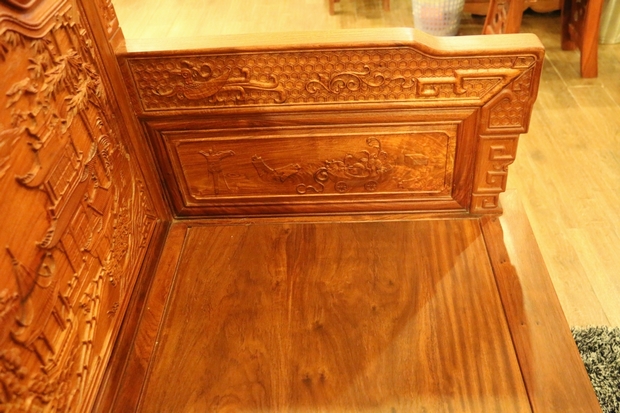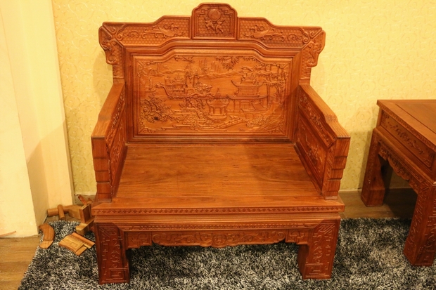沙發(fā)的座椅面平整光滑,極盡原木材質紋理之視覺感受;側面扶手處無任何鏤空面積之留飾,嚴實而框整,整體框架為矩形外觀設計。扶手上端正反兩面位置處,同樣雕繪有上處靠背板處鳳凰圖案形狀之紋飾,扶手底部正反兩面位置則雕繪有一些商周時期使用的器具,如斟酒器、編鐘等。