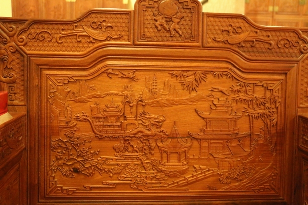 接下來,我們來看看沙發(fā)背靠板正面的主體部分,其畫案外部輪廓形狀呈現如一墨水瓶式形狀設計,上端較為扁實。內部雕刻圖案展現得極為豐富艷麗,正如該款沙發(fā)名字所闡述的那樣——“漢宮春曉”,宛如一幅文人古畫卷中的景致,可以很清晰地看見:那波光漣漪的湖水載著亭臺綺立的龍舟,婉延而緩緩向前開來的景象,前段龍首處神情惟妙惟肖極為莊重而氣定神閑,畫案立于其主體的正中位置,顯得極為惹目和顯眼。在湖水岸邊,靠右端的湖岸上則是那茂密蔥郁的竹林,雖未能身處畫中,卻好似可以聽見,那一葉葉竹瓣隨著微風飄蕩,窸窣碎碎交相搖晃時所發(fā)出的聲響,頗顯幽靜而深遠。另在畫案后方的遠景處,除了稀疏而立的幾目草木郊野,還有一座頂天而豎的寶塔,遠遠眺望著,好似氣派風度。而在湖水的上方,還可以瞥見那兩只展翅高飛的仙鶴,它們乘風而列,自由翱翔時的自在景象,也為整體的畫卷添加了某種只有身處仙境神域時所能感受體會的到的意境神韻感受,另外仙鶴它也代表了長壽與富貴,它仙風道骨,為羽族之長,是為該幅富麗堂皇畫卷中的一處獨特景觀,妖嬈而鶴立。在整體圖案的其他位置,還雕繪有幾目莊嚴氣派矗于湖岸的亭臺樓倚,一尾身處龍舟后方悄悄而出的小帆舟,以及附著于畫卷中央下方位置處,飄縷浮動緩緩而延的祥云…