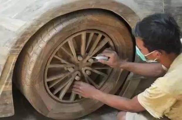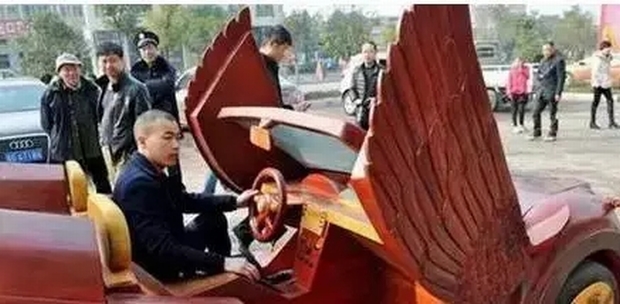千萬別小看了坐在這個紅木跑車里的小哥,人家可是土豪!據說光制作該紅木跑車就花費了幾十萬,耗時半年多,真會玩!