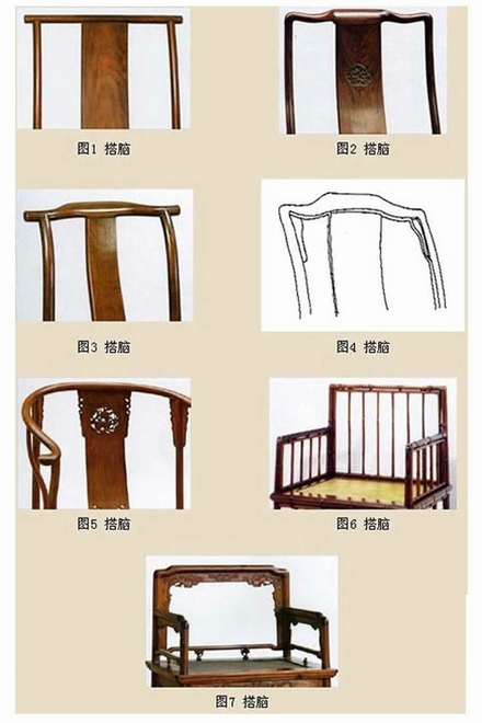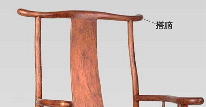 明清家具部件名稱。椅子、衣架等位于家具最上的橫梁叫“搭腦”。如明式椅子中最典型的搭腦有馬鞍式、挖油盞頭式、圓便直式、駱駝背式和天宮翅式等。造型千變?nèi)f化,但都具有流暢、挺秀的特點。